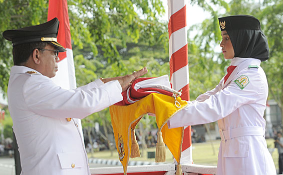 Gubernur Aceh Irwandi Yusuf menyerahkan bendera kepada anggota Paskibra untuk dikibarkan pada peringatan HUT Ke-66 RI di Lapangan Blangpadang, Banda Aceh, Rabu (17/8). SERAMBI/M ANSHAR