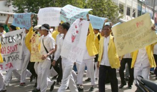 LANGSA – Ratusan mahasiswa yang tergabung dalam Aliansi Mahasiswa Kota Langsa Peduli Pendidikan (AMKLPP), Kamis (24/11) melancarkan aksi unjuk rasa ke gedung DPRK dan Pemko Langsa. Mahasiswa mengutuk pihak manajemen RSUD Langsa yang melarang mahasiswa praktik di RSUD tersebut. Sedagkan demo di Pemko mereka minta Wali Kota Langsa mencopot dr Zahari dari Dirut RSUD Langsa.