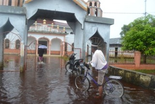 SERAMBINEWS.COM, SINGKIL - Hujan deras yang terus mengguyur wilayah Aceh Singkil, sejak Selasa (27/12/2011) dini hari, menyebabkan pemukiman penduduk, masjid, jalan, perkebunan kelapa sawit dan sawah terendam air. Ketinggian air mulai semata kaki hingga sebetis orang dewasa.