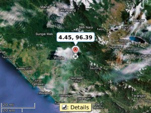 Data yang dirilis BMKG pada pukul 01:09:05 WIB menyebutkan gempa terjadi pada Lokasi 4.45 LU,96.39 BT