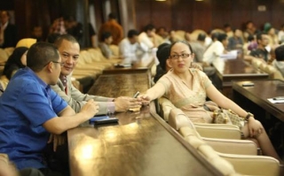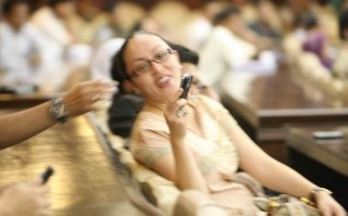 Saat itu, Abbas melintas di jejeran kursi fraksi anggota Demokrat. Angie terlihat menonjol, karena berbalik belakang lalu memperlihatkan smartphone jenis BlackBerry Bold 9000.