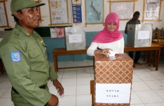 Pemilih memasukan surat suara ke dalam kota suara saat pemilihan ketua pemuda Desa Lamgapang, Ulee Kareng, Banda Aceh, Minggu (27/5). SERAMBI/BUDI FATRIA