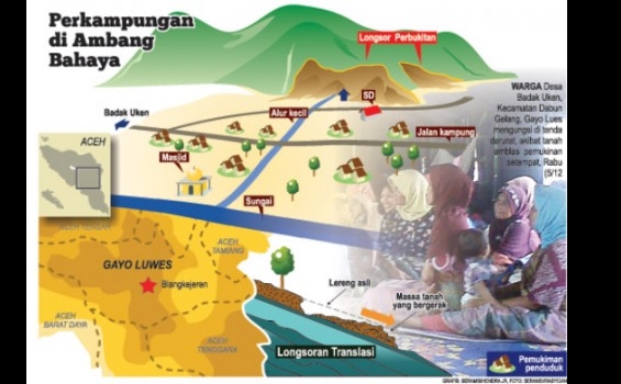 JUMLAH warga Badak Uken yang sudah mengungsi hingga Rabu (5/12) mencapai 125 KK dari total 145 KK (690 jiwa) yang ada dalam tiga dusun di desa itu. Berdasarkan pengamatan kami di lokasi, lokasi yang amblas dan retak sudah mencapai lima hektar lebih meski lokasinya terpisah-pisah. Areal amblas terluas mencapai 50 x 50 meter. Desa Badak Uken sangat berpotensi atau rawan tanah longsor, karenanya warga Badak Uken harus direlokasi ke lokasi lain yang lebih aman.