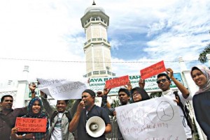 Dalam aksi kemarin, belasan demonstran yang tergabung dalam Forum Peduli Anak Aceh tersebut mengusung sejumlah poster dan tulisan kecaman yang ditulis di atas busa, di antaranya bertuliskan, ‘save Atjeh dari tsunami moral’. Lalu ada tulisan ‘lindungi anak Aceh’, ‘hentikan! kekerasan terhadap anak!!’, ‘tegakkan hukum dan keadilan’ serta sebuah tulisan lainnya, ‘Rajam!!! pelaku kekerasan terhadap anak’.