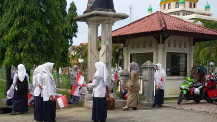 Siswa dengan membawa bendera merah putih itu melambaikan ke Presiden Joko Widodo yang akan melintasi di jalan depan kantor bupati tersebut rangkaian kunjungan ke Meulaboh.