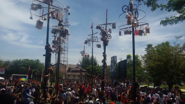 Tak hanya itu, saking semangatnya warga yang menyaksikan acara tahunan tersebut, ratusan warga juga rela duduk di sepanjang median jalan guna menyaksikan perlombaan untuk memeriahkan peringatan HUT ke-70 Republik Indonesia.