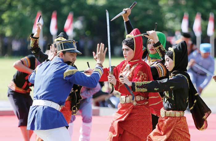 Tarian tradisi termasuk tari kreasi bertema perang melawan penjajah menghentak berbagai penjuru Aceh ketika peringatan HUT ke-70 RI, kemarin. Di Lapangan Persada Blangpidie, Aceh Barat Daya, sebelum upacara ditampilkan drama Teungku Peukan pahlawan dari Manggeng ketika menyerang tangsi yang ditempati penjajah Belanda di Blangpidie.