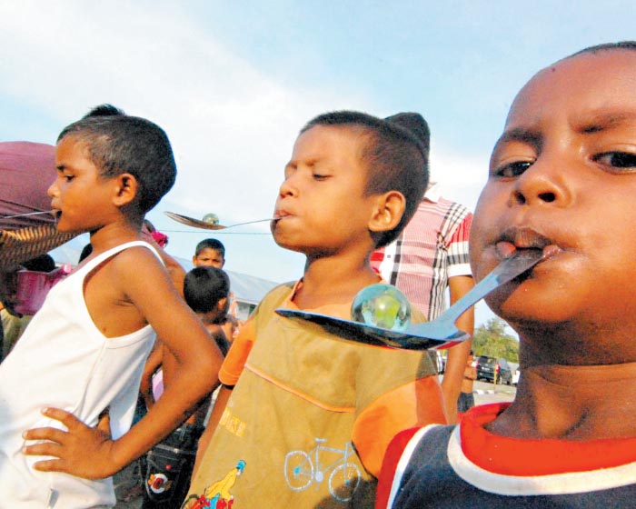 ANAK-anak Rohingya mengikuti lomba bawa kelereng dengan sendok dalam rangka memeriahkan HUT RI di shelter Desa Blang Adoe, Kecamatan Kuta Makmur, Aceh Utara, Selasa (18/8). SERAMBI/SAIFUL BAHRI