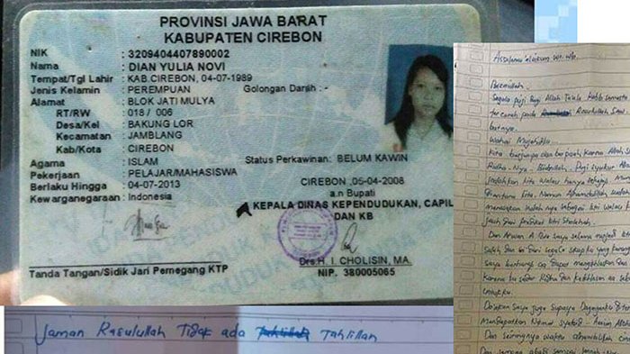 Kartu identitas dan surat wasiat Dian Yulia Novi, terduga jaringan teroris Bekasi yang berencana meledakkan bom istana. (facebook)
