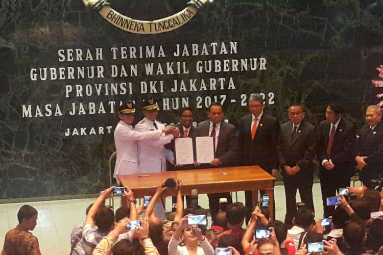 SERAMBINEWS.COM - Gubernur dan Wakil Gubernur DKI Jakarta Anies Baswedan dan Sandiaga Uno melakukan serah terima jabatan di Balai Agung, Balai Kota DKI Jakarta, Jalan Medan Merdeka Selatan, Senin (16/10/2017) petang.