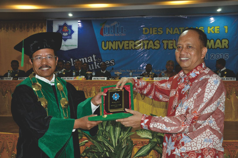 Rektor UTU Prof Jasman J Ma'ruf (kiri) menyerahkan cendramata kepada Menristekdikti Prof Mohammad Nasir pada dies natalis ke-1 UTU tahun 2015 silam.