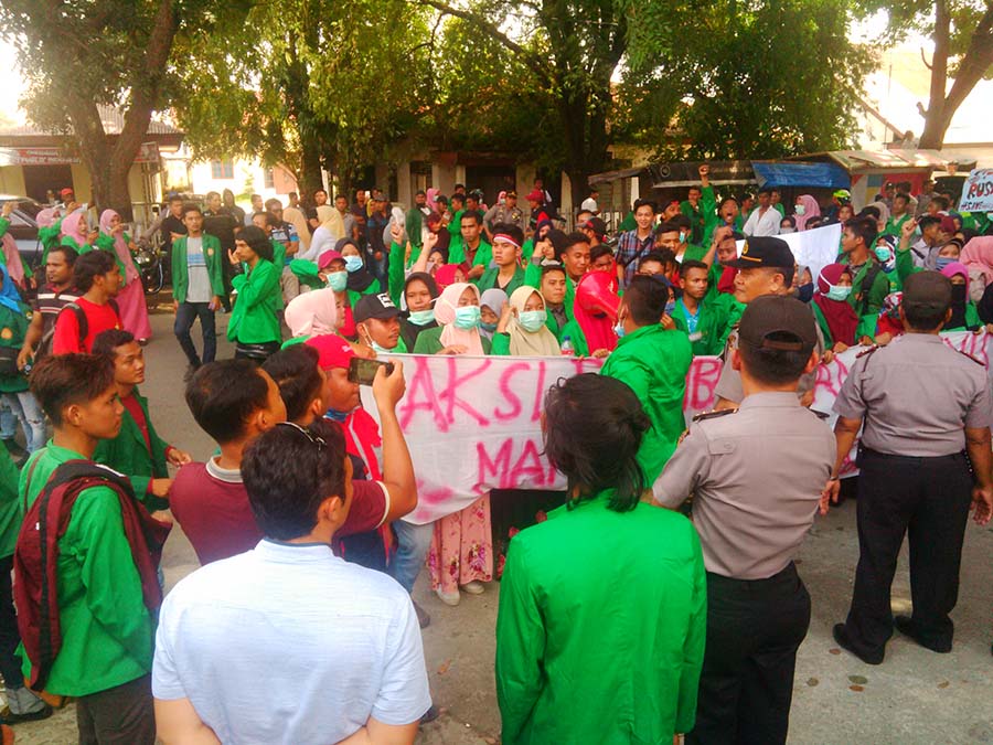 ratusan mahasiswa yang tergabung dalam forum besar mahasiswa (forbesma) membawa sejumlah spanduk