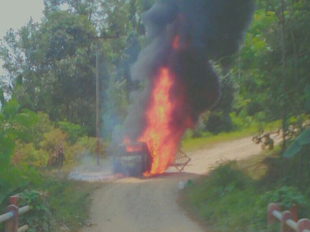 Mobil pikap milik Haji Mukmin yang melaju dari arah Bengkelang, Aceh Tamiang, menuju Kecamatan Simpang Jernih, Aceh Timur, terbakar dalam perjalanan di Dusun Kekening, Gampong Simpang Jernih, Selasa (20/3/2018) sekitar pukul 13.30 WIB.