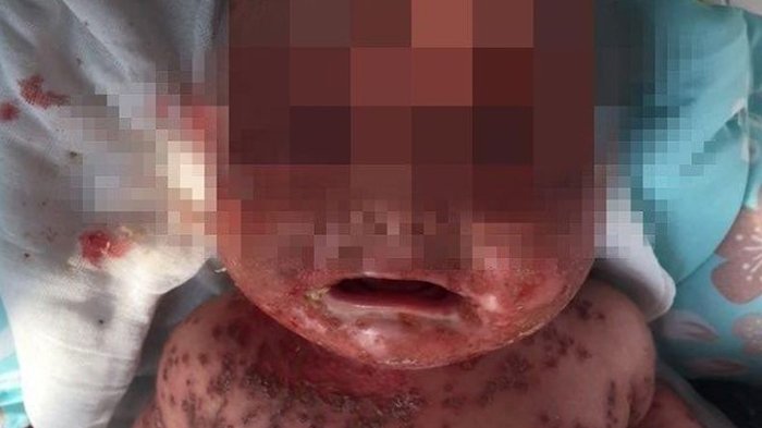 Seluruh tubuh bayi tersebut melepuh dan tertutup dengan luka.