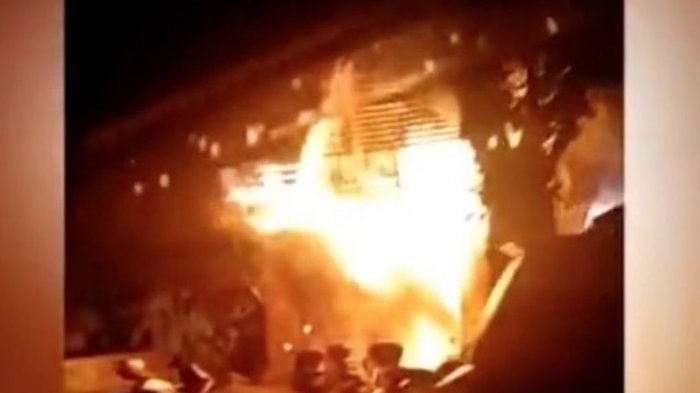 Seseorang diduga terlibat pertengkaran, sebelum mengendarai sepeda motor dan menutup pintu gedung, kemudian menyalakan api.