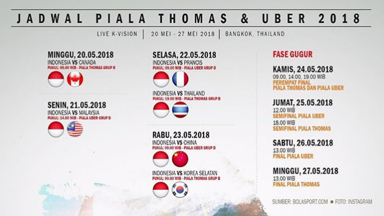 Link Live Streaming dan Live Score Piala Thomas dan Uber 2018, Mulai 20 Mei Pukul 09.00 WIB