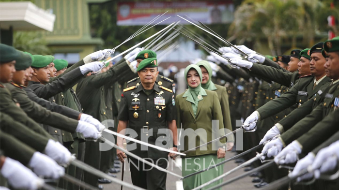 SERAMBINEWS.COM, BANDA ACEH - Panglima Kodam Iskandar Muda (Pangdam IM), Mayjen TNI Teguh Arief Indratmoko bersama istri tiba di Makodam setempat, Banda Aceh, Selasa (21/8/2018).