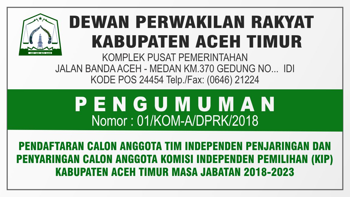 Dalam rangka melaksanakan ketentuan Undang-Undang Nomor 11 Tahun 2006 tentang Pemerintahan Aceh dan Qanun Aceh Nomor 6 tahun 2016 tentang Penyelenggaraan Pemilihan Umum dan Pemilihan di Aceh, DPRK Aceh Timur melalui Panitia Seleksi Calon Anggota KIP Kabupaten Aceh Timur Masa Jabatan 2018 – 2023 membuka pendaftaran untuk Menjadi Calon Anggota Tim Independen Penjaringan dan Penyaringan Calon Anggota KIP Kabupaten Aceh Timur Masa Jabatan 2018 – 2023 dengan Persyaratan sebagai berikut :