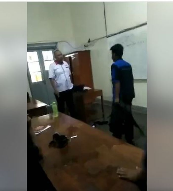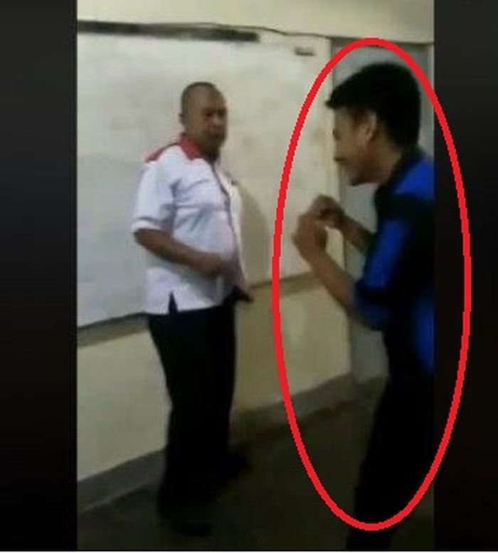 Tak berhenti di situ, si siswa mengambil pose layaknya petinju dengan mengepalkan telapak tangan dan terus memaki gurunya.
