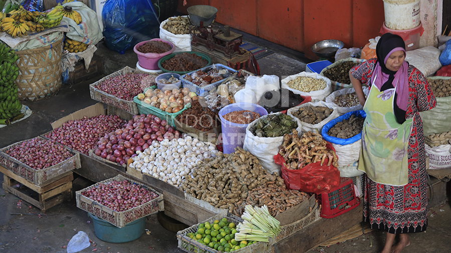 Pedagang menjual berbagai kebutuhan bumbu dapur dan sayur di pasar Kartini Peunayong, Banda Aceh, Selasa (26/3/2019).
