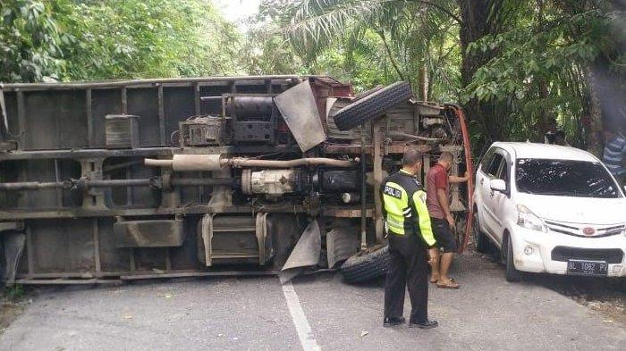 Patah As Tarik, Truk Fuso Bermuatan Kelapa Sawit Terguling di Lintas Subulussalam-Singkil