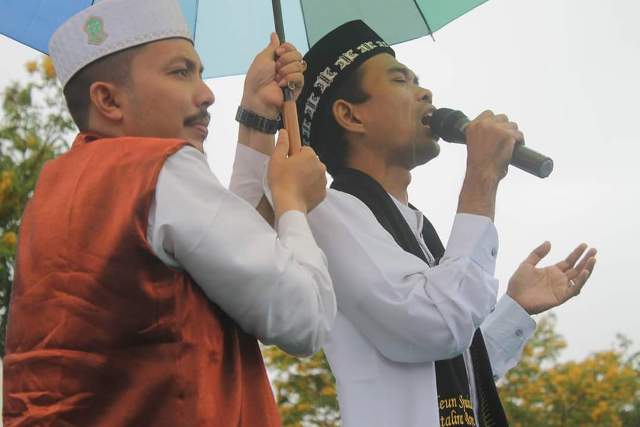 Tapi UAS masih tetap berceramah yang dipayungi panitia Tgk Nasruddin, Ketua Forum Santri Indonesia (FSI) Aceh Utara.