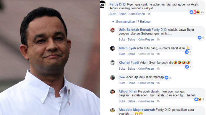 “Pgen gue culik ne gubernur, biar jadi gubernur Aceh. Tegas k aseng, lembut k rakyat,” tulis Ferdy Di Di pada kolom komentar.
