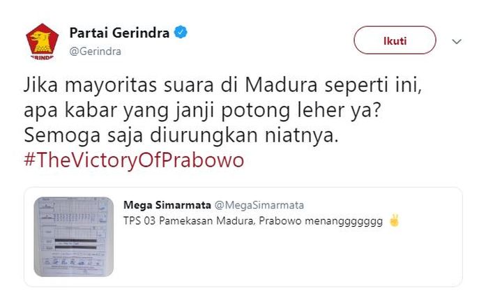 "Jika mayoritas suara di Madura seperti ini, apa kabar yang janji potong leher ya? Semoga saja diurungkan niatnya. #TheVictoryOfPrabowo," balas akun Twitter @Gerindra seperti dikutip Gridhot.ID, Rabu (17/4/2019).