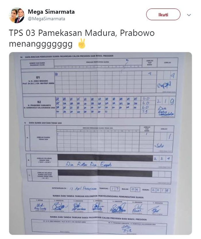 "TPS 03 Pamekasan Madura, Prabowo menanggggggg," tulis @MegaSimartama.