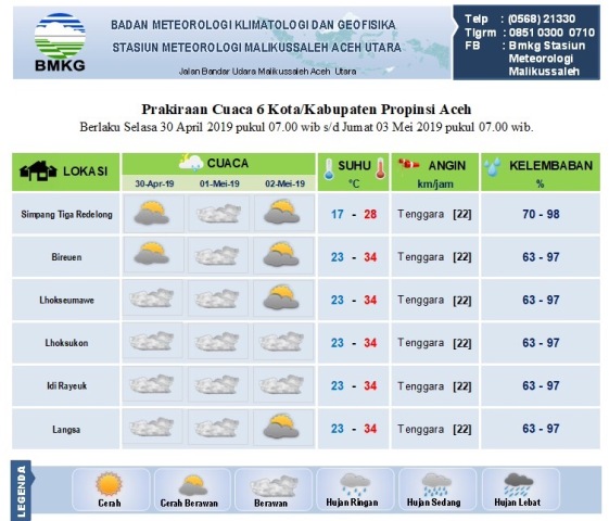 Lalu, Kamis (2/5/2019), cuaca cerah melanda Bener Meriah, Bireuen, dan Lhokseumawe.