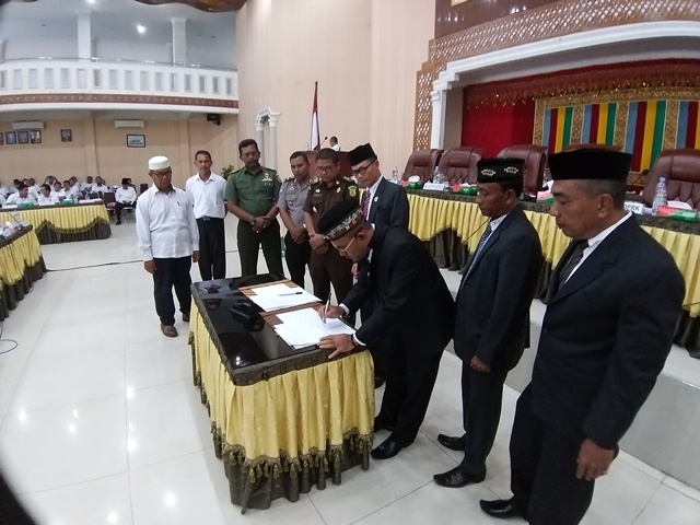 Setelah pengesahan dilaksanakan penandatanganan berita acara persetujuan bersama APBK-P 2019 antara Bupati diwakili Wakil Bupati (Wabup), Muslizar MT dengan Ketua DPRK, Zaman Akli dan Wakil Ketua II DPRK, Jismi.