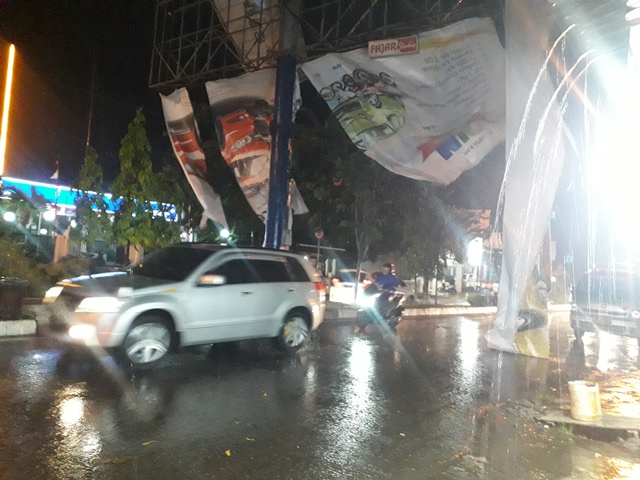 Selain pohon tumbang, badai juga menyebabkan dua baliho besar di Jalan Nasional copot disapu angin.