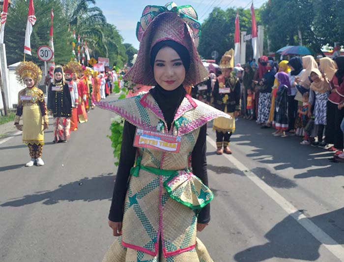 Salah seorang peserta dari SDN 3 Bireuen mengenakan pakaian bagian luar bukan dari kain, tapi anyaman tikar daun pandan dan ditulis Putri Tikar di dadanya.