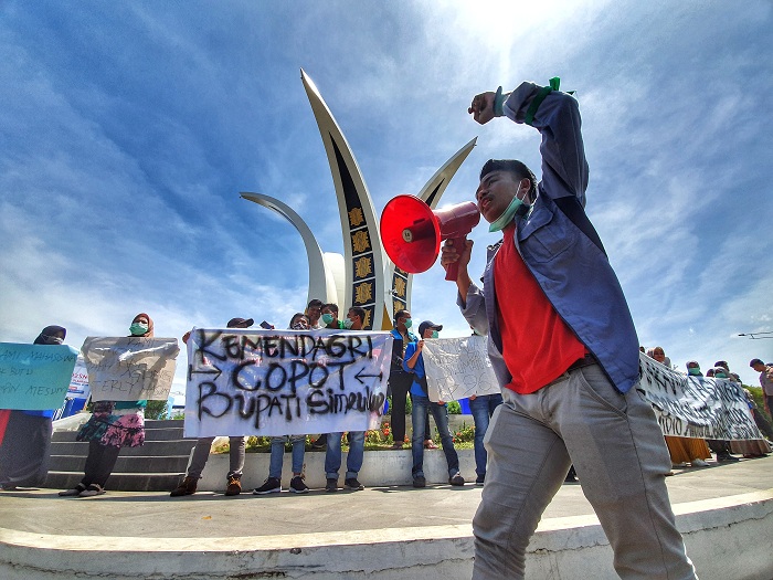 “Kami mahasiswa turun ke jalan menyuarakan ke Mahkamah Agung RI dan Kemendagri agar segera mengeluarkan fatwa terkait video amoral Bupati Simeulue, agar ketenteraman dan ketenangan masyarakat Simeulue dapat kondusif,” teriaknya.