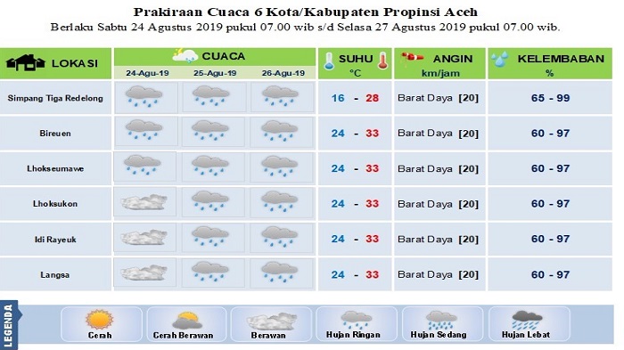 Informasi yang dishare melalui grup WhatsApp Info BMKG Malikussaleh, untuk Sabtu (24/8/2019), Bener Meriah, Bireuen, dan Lhokseumawe, akan diguyur hujan. Sedangkan di Aceh Utara, Aceh Timur, dan Langsa, cuacanya hanya berawan.