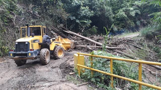 Untuk membersihkan tanah longsor serta beberapa pohon kayu yang menumpuk di badan jalan, dikerahkan satu unit alat berat dari BPBD setempat.