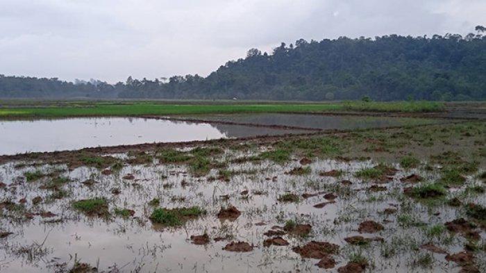 Lahan pertanian yang rusak itu, setelah ditanam dengan usia tanam baru mencapai dua pekan.