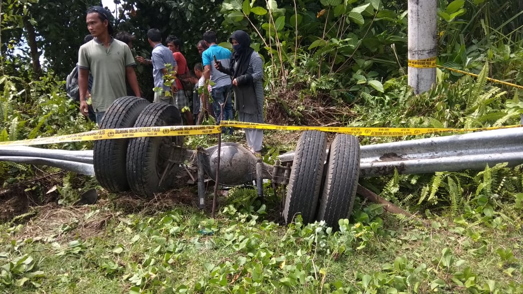 Karena truk tak mampu melaju di tanjakan, akhirnya truk yang bermuatan CPO tersebut terjun ke jurang dan roda bagian belakang terlepas dari bodi truk.