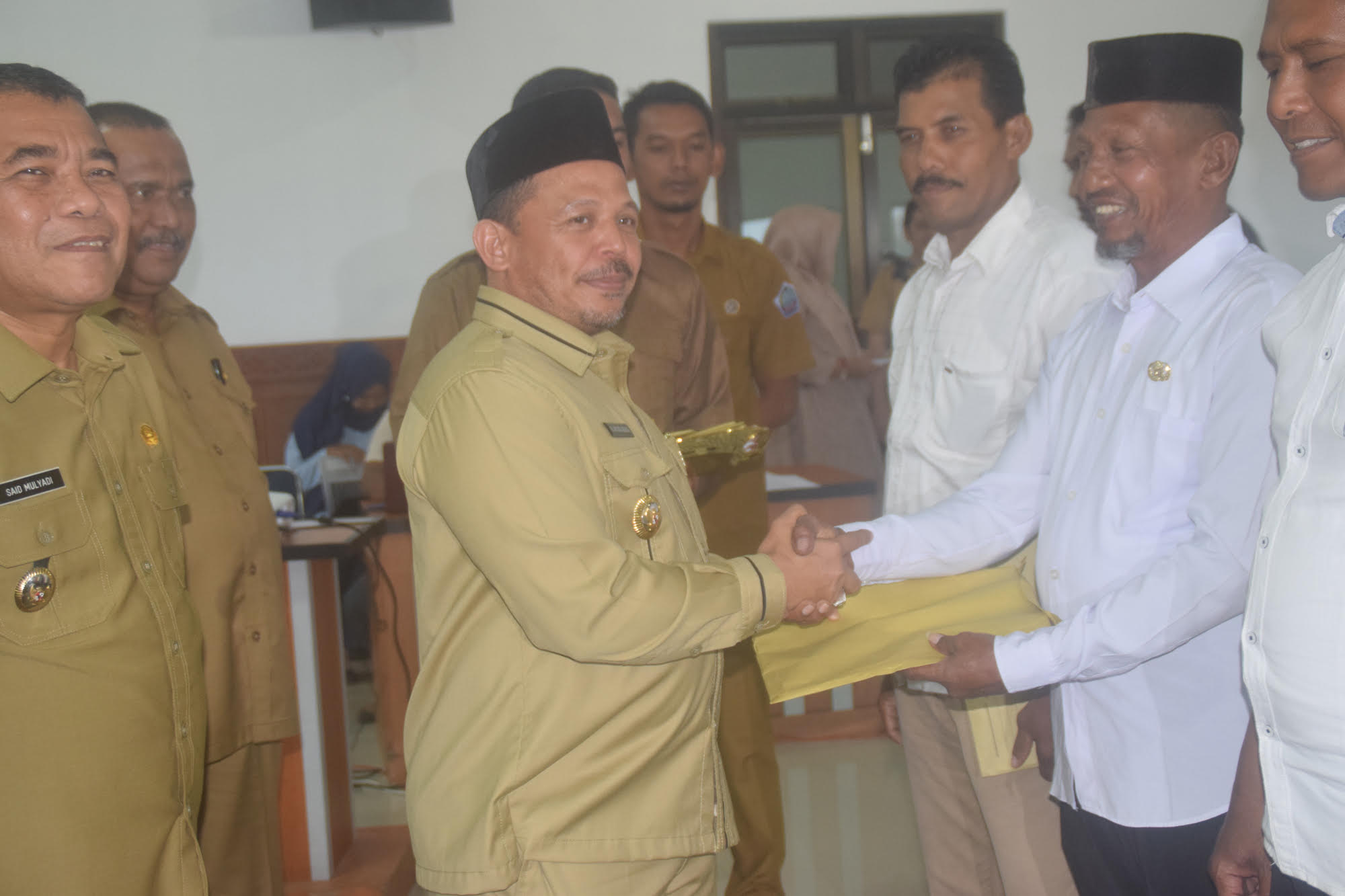 Bupati Pidie Jaya, H Aiyub Abbas, didampingi Wabup, H Said Mulyadi, Selasa (7/1/2020) di Oprom Kantor Bupati Setempat, menyerahkan DIPA/Plafon Dana Gampong secara simbolis.