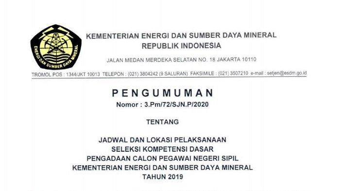 Informasi disampaikan melalui pengumuman Nomor 3.Pm/72/SJN.P/2020 tentang Jadwal dan Lokasi Pelaksanaan Seleksi Kompetensi Dasar Pengadaan Calon Pegawai Negeri Sipil Kementerian Energi dan Sumber Daya Mineral Tahun 2019.