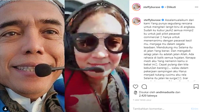 "Sudah ku kubur jauh2 semua mimpi2 ku untuk jadi pilot pesawat commercial hanya untuk menemanimu dengan pesawat kecil mu, menjaga mu dalam segala keadaan, Mendukung mu Selama itu di jalan Yang benar, Dan mengabdi selagi jalan itu adalah jalan Allah..." ungkap Steffey dalam postingannya.