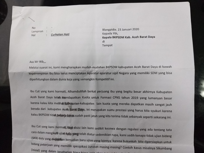Lewat Sepucuk Surat, Peserta CPNS Abdya Curhat kepada Panselda, Simak Curahan Hatinya