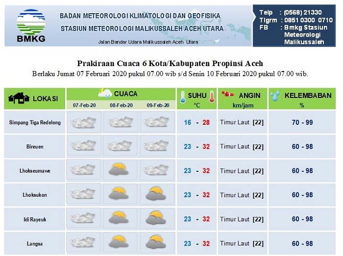Sesuai informasi yang di-share melalui grup WhatsApp Info BMKG Malikussaleh, pada Jumat (7/2/2020), keenam wilayah, yakni mulai Bener Meriah, Bireuen, Lhokseumawe, Aceh Utara, Aceh Timur, dan Langsa, cuacanya hanya berawan.