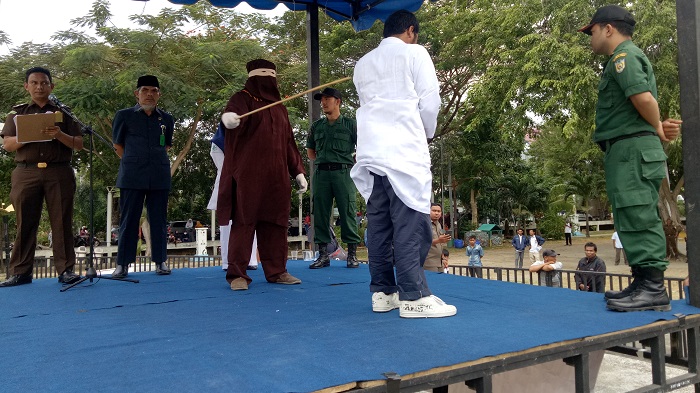 Siang tadi, 11.30 WIB dicambuk bersama 6 pelanggar syariat Islam lainnya di Taman Bustanussalatin (Taman Sari), Banda Aceh.