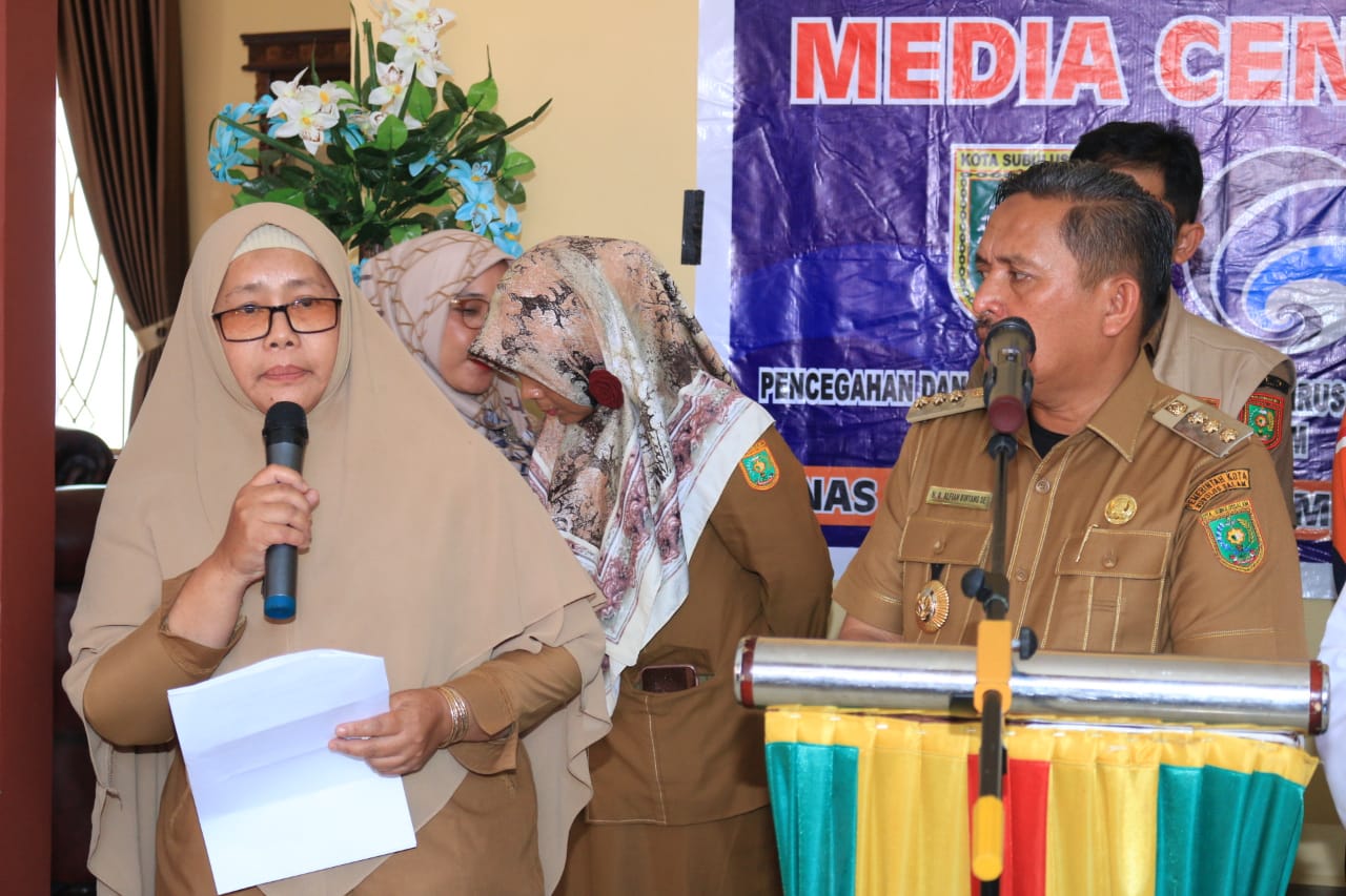 Juru bicara Satgas Tim Gerak Cepat RSUD Subulussalam, dr Diana Dewi saat konferensi Pers terkait penanganan virus corona serta Hasil Laboratorium Pasien Dalam Pengawasan Corona asal Kota Subulussalam yang dirujuk ke Rumah Sakit Umum Zainal Abidin (RSUZA) Banda Aceh, Selasa (24/3/2020) di Pendopo Wali Kota Subulussalam.