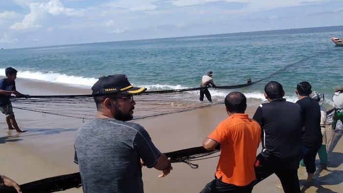 Sementara di bibir pantai, para nelayan lainnya sudah bersiap menarik perlahan, bahkan sebagian nelayan sudah menyiapkan tali di pinggang, untuk menarik tali pukat tersebut.
