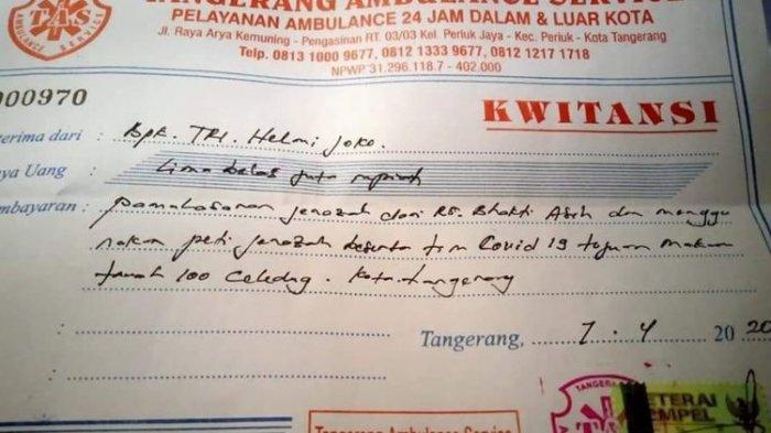 Kuitansi dengan kop surat Tangerang Ambulance Service (TAS) tertanggal 7 April 2020 tersebut memuat biaya penanganan jenazah dengan peti mati beserta tim Covid-19 sebesar Rp 15 Juta.