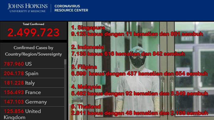 Data John Hopkins University Selasa (21/4/2020), Singapura telah mengonfirmasi 9.125 kasus infeksi corona.