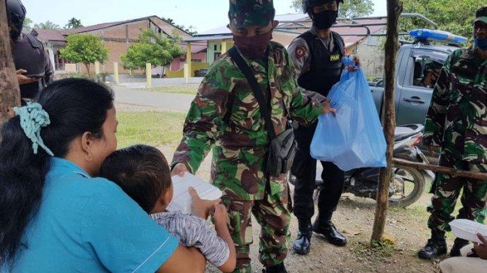Selain kepada pengendara kendaraan, personel TNI-Polri ini juga berkeliling desa untuk membagikan nasi kotak kepada warga kurang mampu.