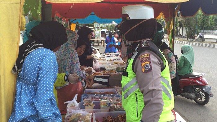 Sejumlah anggota Satlantas Polres Lhpkseumawe bersama personil Dinas Perhubungan mengatur lalu lintas di Simpang BTN Lhokseumawe, Senin (27/4/2020) sore. Hal ini untuk antisipasi jangan sampai terjadi kemacetan menyusul ramainya masyarakat membeli penganan berbuka puasa.